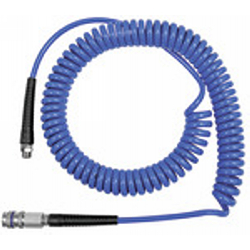 Spiralschlauch-Kupplung-Set, Stahlkupplung NW 7,8, PU, Schlauch-ø 10x6,5, PN bei 23 °C max. 11 bar, Länge 3,0 m. Der äußerst elastische Polyurethanschlauch verfügt über eine ähnliche Rückholkraft wie der herkömmliche Polyamid-Spiralschlauch, neigt jedoch weniger zur Schleifenbildung und hat eine deutlich höhere Abriebfestigkeit. Die Gefahr des Verkratzens von lackierten oder empfindlichen Oberflächen ist somit geringer. Der Schlauch ist extrem flexibel und knickfest.